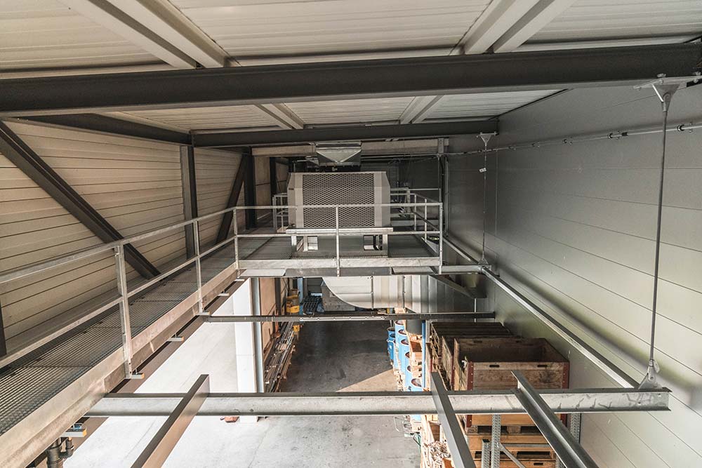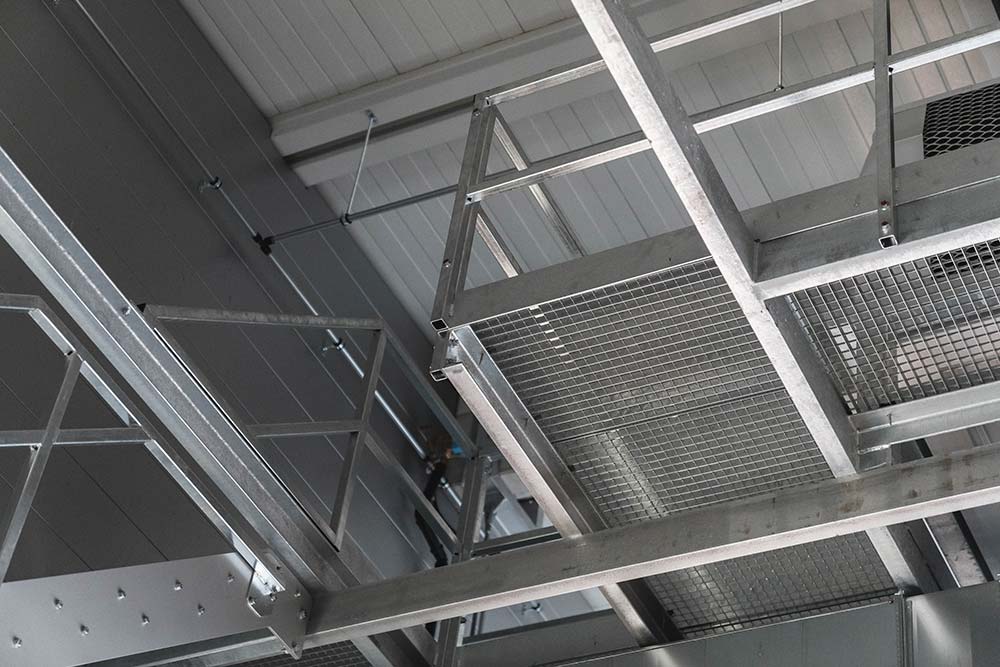 Verzinkte Stahltreppen mit Aufgangsumwehrung, Laufstegkonstruktion mit 4 Lüftungsgeräten als Insellösung ausgeführt mit umlaufendem Wartungssteg.